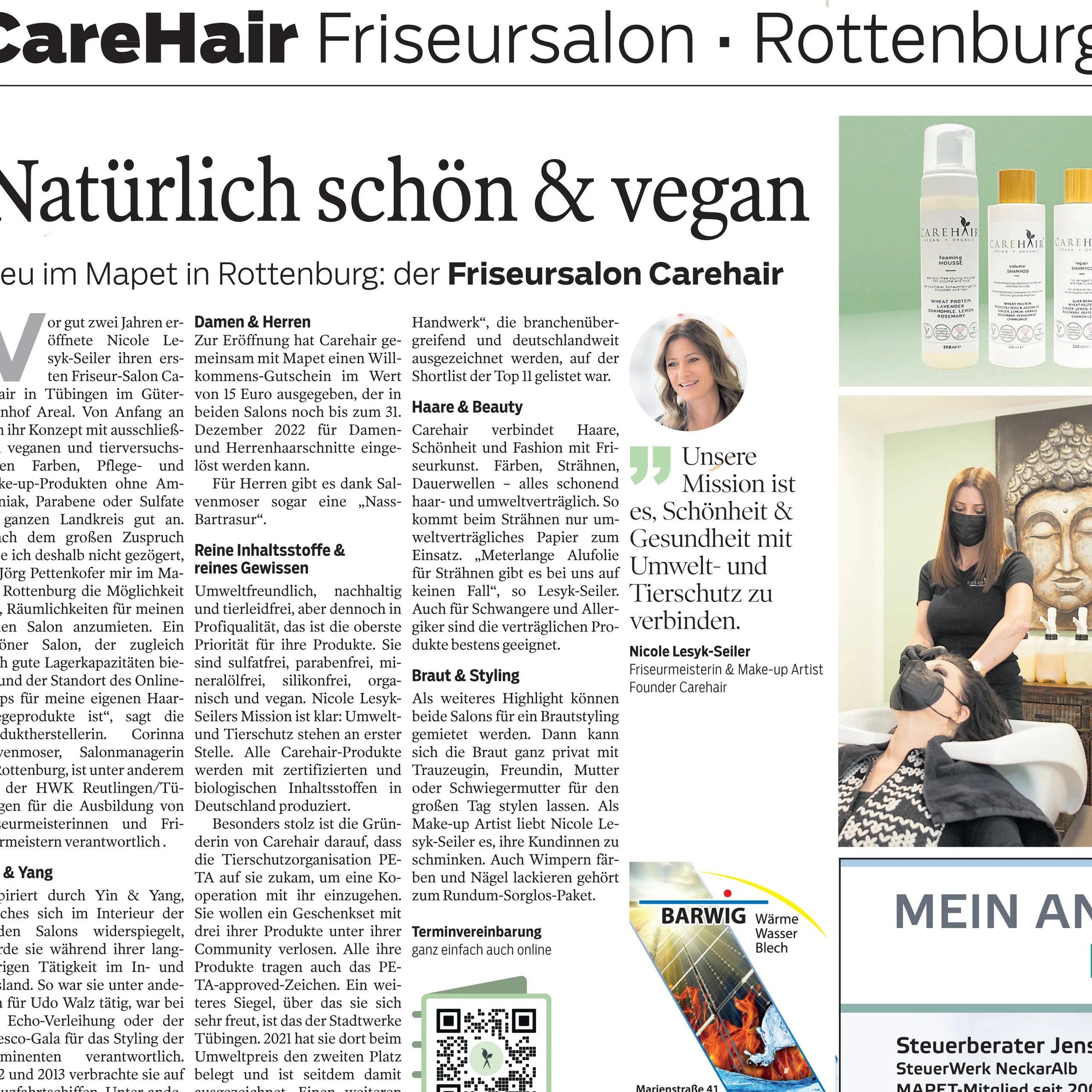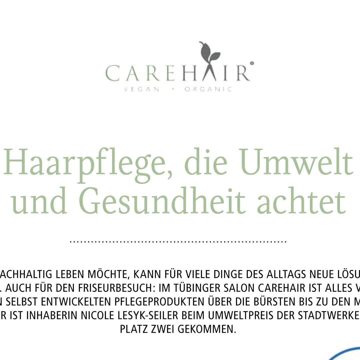 CareHair bietet regionale, vegane Haarpflegeprodukte und Friseur-Dienstleistungen an, die auf Nachhaltigkeit Tierwohl, und natürliche Inhaltsstoffe setzen. Unsere Lösungen fördern gesundes Haar, Kopfhautpflege und Umweltverantwortung.